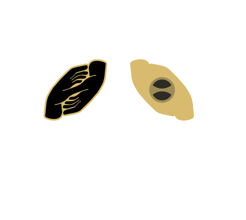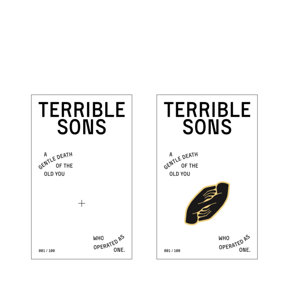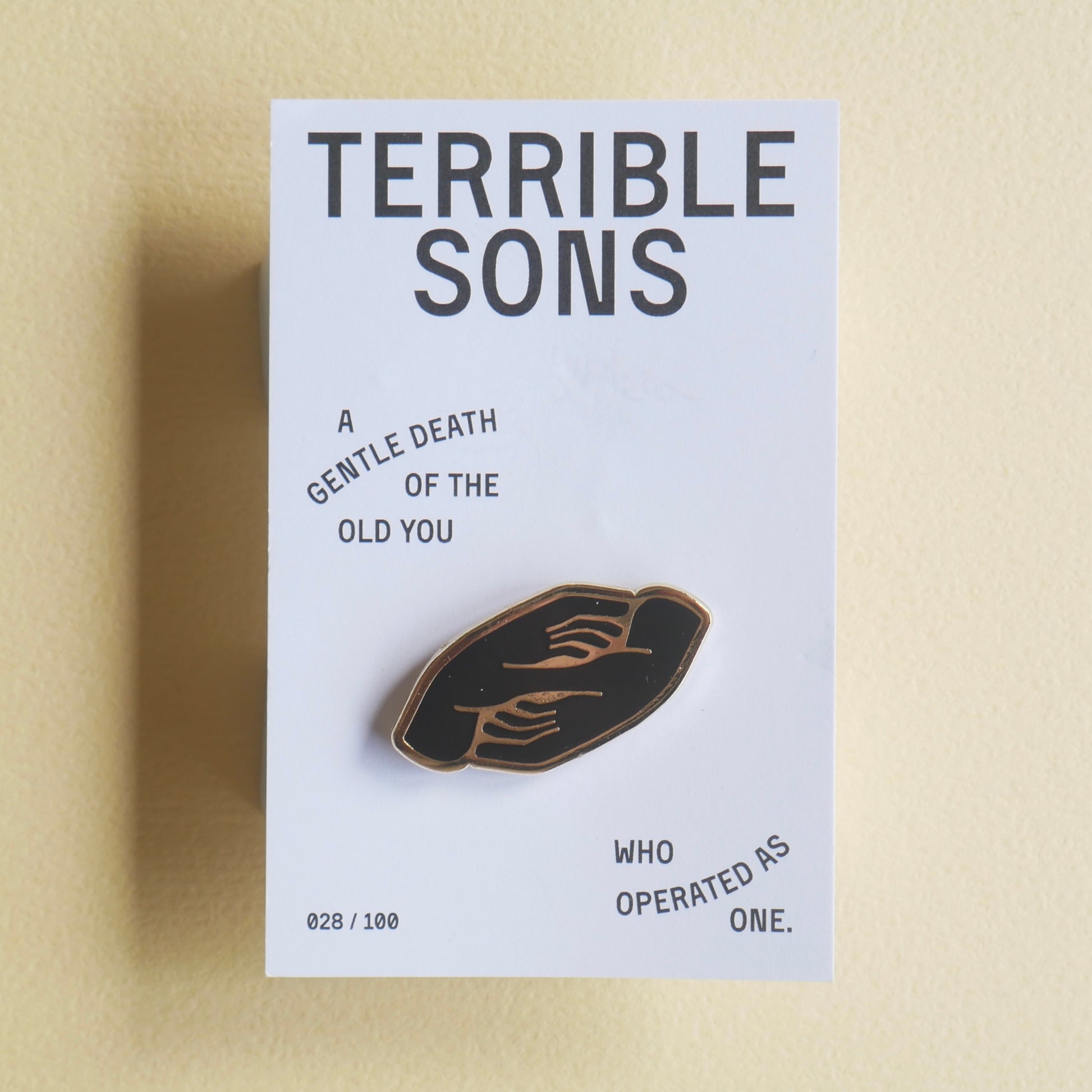 Enamel plated black & gold metal pin of two hands clasped together. Arrives pinned to a small numbered card. Only 100 made. Limited.